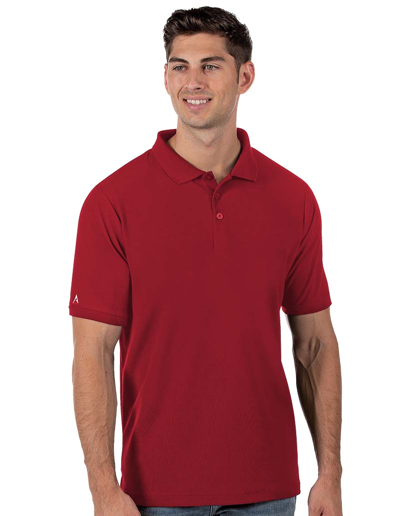 Desert Dry™ moisture wicking pique knit, solid short sleeve polo with flat knit collar and cut & sew cuffs. UPF 50+. Antigua triangle patch at right cuff. S-4XL (Select colors in S-3XL and S-5XL) *Women’s matchable style