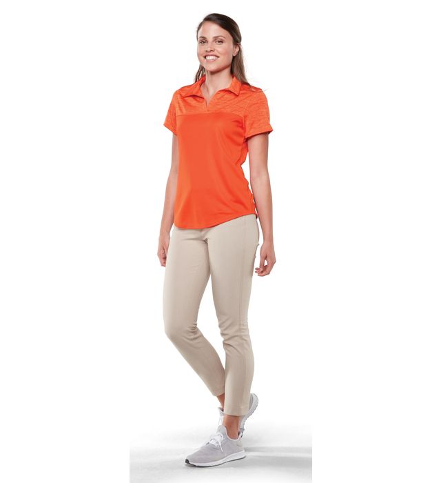 * 4.3 ounce 100% polyester heathered wicking knit top body, collar and sleeves * 3.3 ounce 100% polyester wicking knit solid body * Wicks moisture * Ladies' fit * Tag-free label * Self-fabric Johnny collar * Set-in sleeves * Contoured bottom