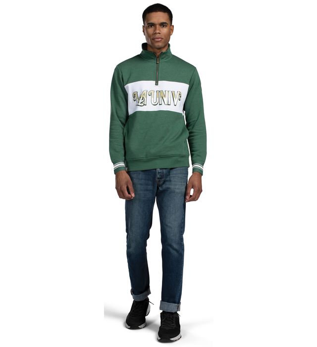 * 7.6 ounce 55% polyester/41% cotton/4% rayon, super soft fleece * Woven label * Exterior faux leather logo loop label * Quarter zip pullover style with antique brass zipper and zipper pull * Set-in sleeves * Side seam pockets * Spandex blend rib-knit inner collar & cuffs and bottom
