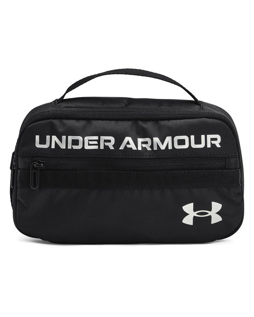 100% polyester; UA Storm technology delivers an element-battling, water-repellent and stain-repellent finish; Large main compartment fits toiletries with full length zipper so it can lay flat; Front dual-access pocket & large internal mesh pocket; Tough, PU-coated bottom & back panels for added durability; Dual-carry side & top strap construction for multiple ways to carry or hang-up; Dimensions: 3.7"W x 6.3"H x 9.8"L; Volume: 4 L;