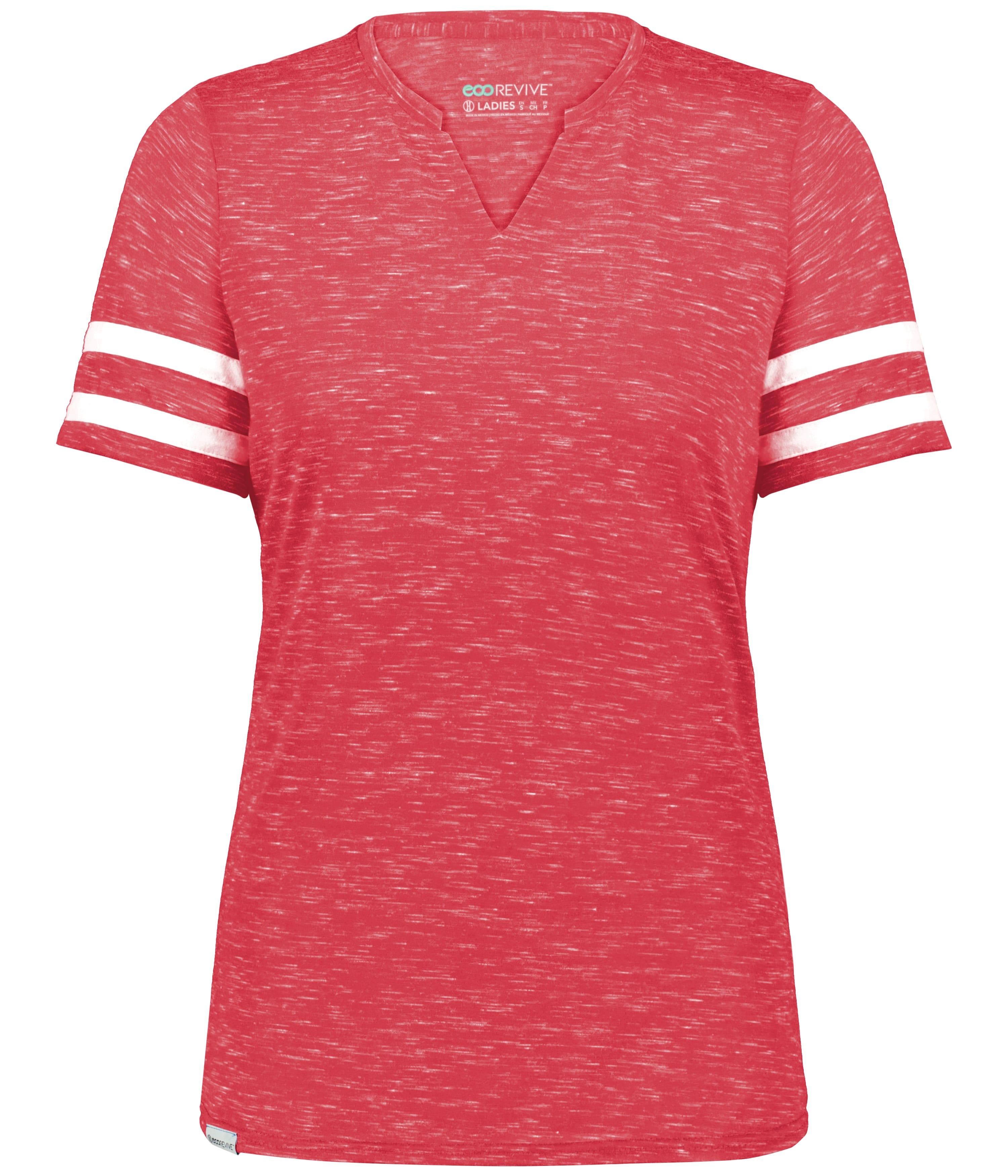 * Eco-Revive product featuring 95% recycled polyester/5% cotton * Wicks moisture * Tagless label * V-neck collar * Set-in sleeves