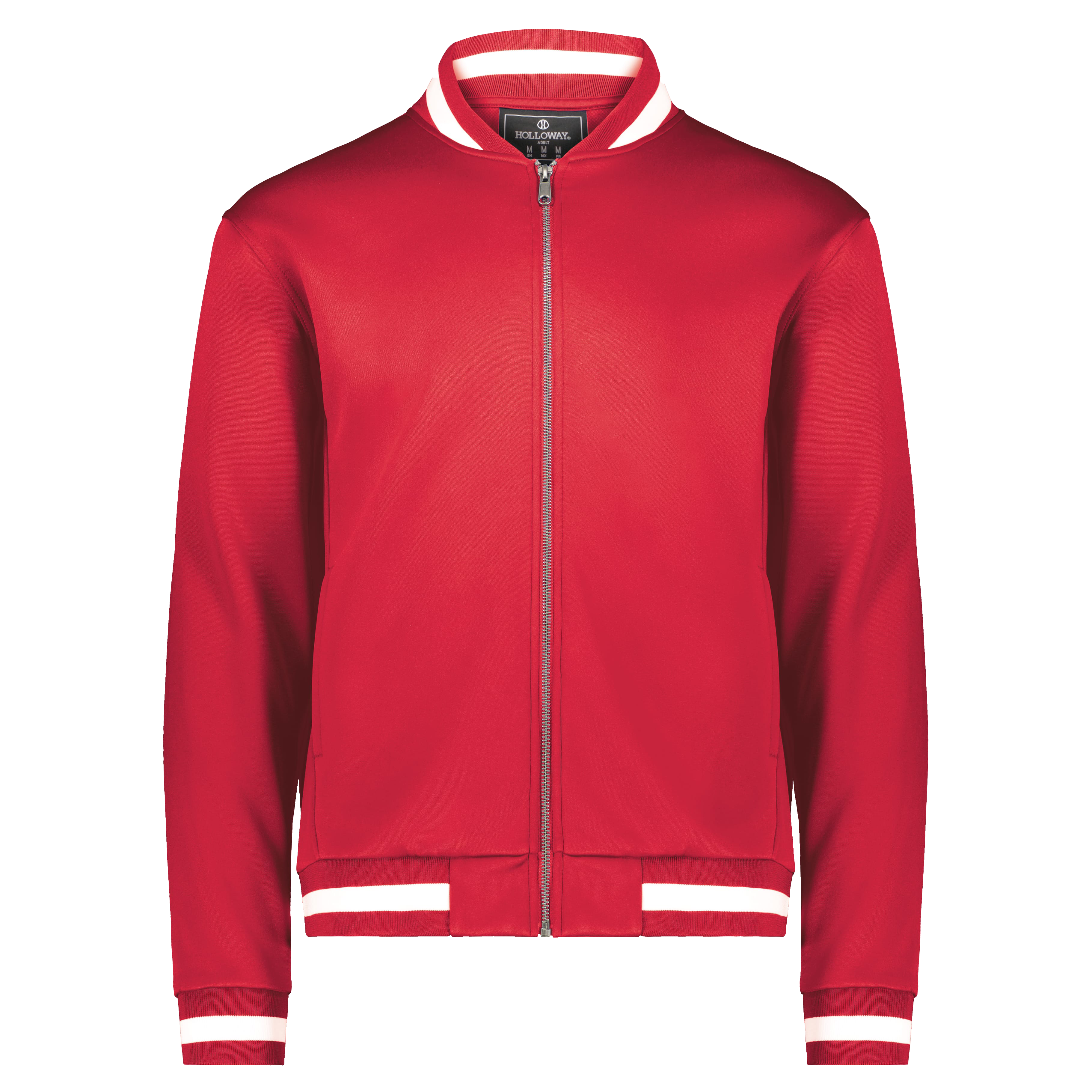 * 100% polyester double-knit * Woven label * Front zipper * Set-in sleeves * Front pockets * Dual inside pockets * Striped rib-knit collar, cuffs and bottom band