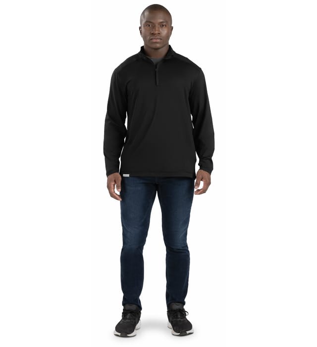 Featuring moisture-wicking technology, this pullover keeps you dry during various activities. Its design includes a tag-free label for added comfort, especially during extended wear. The quarter zip style allows for easy temperature regulation and a versatile look.