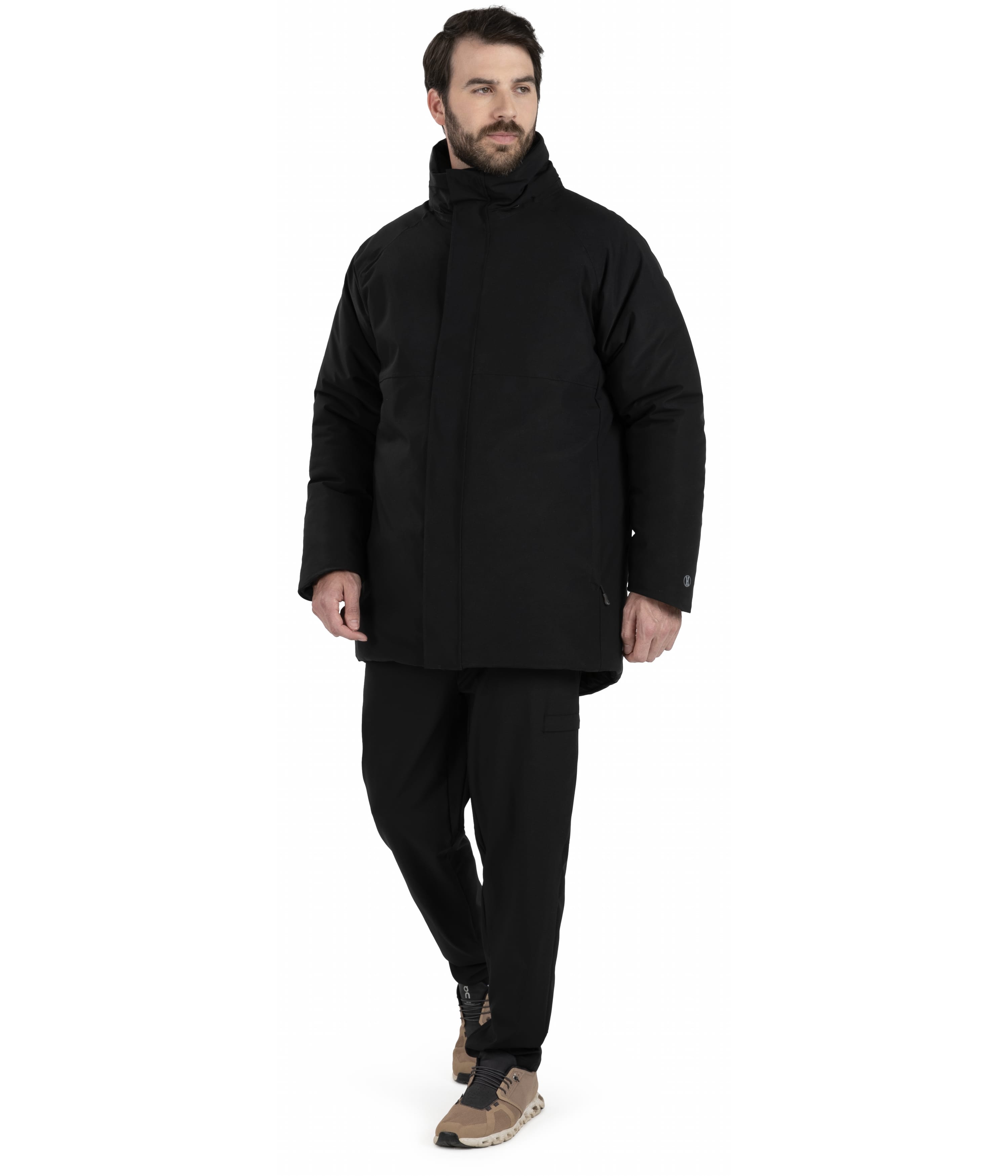 * Eco-Revive(r) product featuring 65% recycled polyester/35% polyester * 5,000MM fabric waterproof rating 3,000g/M2 fabric breathability rating on shell * 100% polyester lining * 240 gram insulation in body, 200 gram insulation in side panels and sleeves * Heat sealed label * High collar, two-way front zipper with snap front storm placket * Detachable zippered insulated hood with inside adjustable shockcord around face, lateral shockcord and stiffened visor to allow for maximum protection from elements * Critical seams sealed * Inside zippered valuables pocket * Inside glove pocket on wearers right side * Interior all access decoration zipper * Raglan sleeves with inner poly/spandex storm cuffs for added weather protection and comfort * Front zippered pockets * Open bottom hem with drawcord adjustment, access located in right pocket * Dropped tail bottom